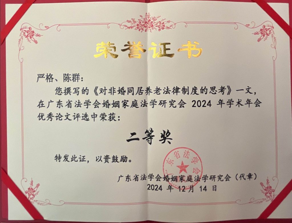 近日,广东省法学会婚姻家庭法学研究会2024年会在广州隆重召开,本次年会主题为“老年人与未成年人权益保护理论与实践问题研讨暨家庭中弱者权益保护论坛”。全国各地法院、高校、律师共投稿近200篇论文,经过专家严格评审,评审出一等奖三名,二等奖六篇,三等奖九篇,优秀奖十二篇。圳品律师事务所严格、陈群合著的论文《对非婚同居养老法律制度的思考》荣获二等奖第一名,充分展现了圳品所在婚姻家庭和养老继承领域的专业实力和研究深度。