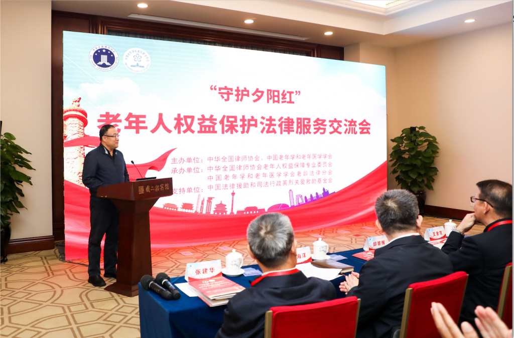 中华全国律师协会副会长万立、中国老年学和老年医学学会秘书长王金龙和司法部律师工作局一级巡视员、全国律师行业党委专职副书记方海洋出席会议并发表致辞。中华全国律师协会副秘书长王焱主持会议。最高人民法院民事审判第一庭、最高人民检察院公益诉讼检察厅、民政部老龄工作司、司法部公共法律服务管理局、中国法律援助和司法行政英烈关爱基金会、中国老龄协会权益部等单位派员出席会议。