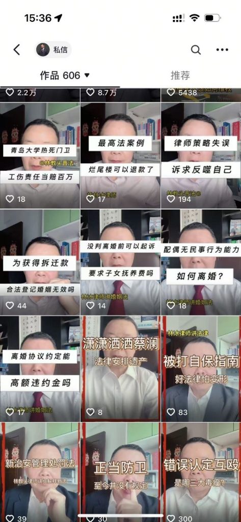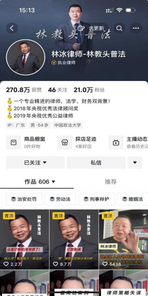 林冰律师的内容产出非常高频,经常一天可以产出5条以上的内容,而且每一条内容都是法律干货,可能画面、文案没那么精细,但是重在时效性强,内容量大管饱,不错过任何一条社会热点法律内容。